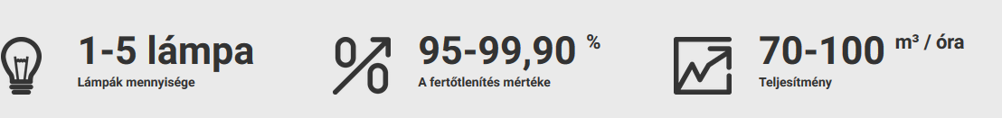 A légtisztítóban lévő lámpák sugárzása elegendő a helyiségben található összes mikroorganizmus elpusztításához .A levegőfertőtlenítés hatékonysága a DEZAR UV- légtisztító modelljétől függően 95-99,9% .